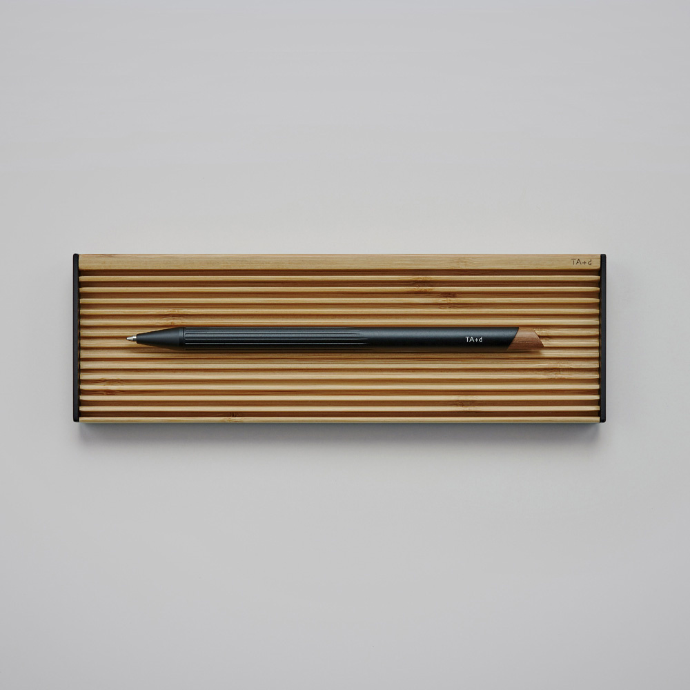 一個有著弧度與溫度的桌上收納,讓一支筆自然停留在最美的位置,以竹材的格柵設計,陳列與保護你珍藏的物件,也能放置你喜愛的照片與紙卡。