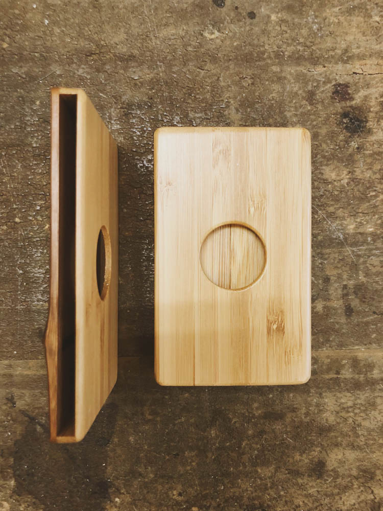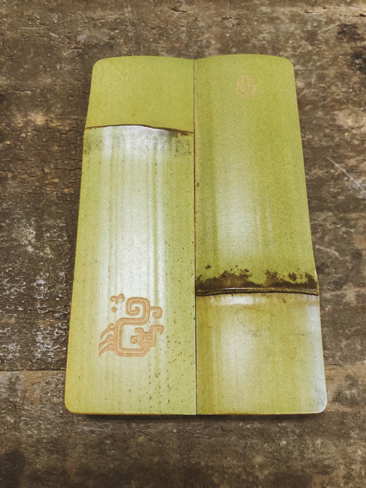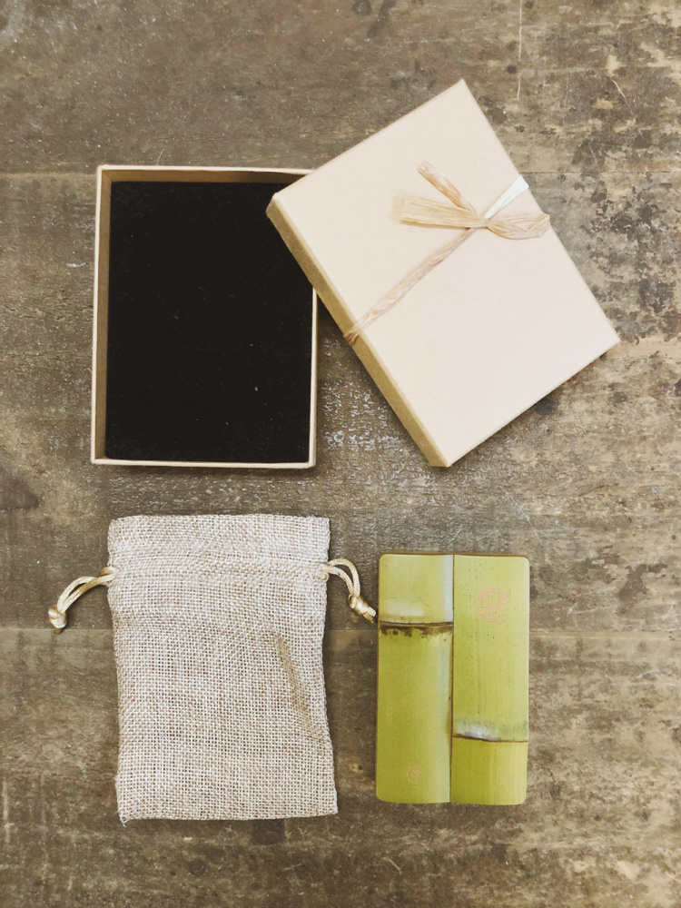竹簡卡夾以文雅的竹檢造型將兩片竹片對貼製成,選用孟宗竹,並保留竹節之美。裡面有鐵片設計,作爲勾住卡片的固定作用,平時放置在辦公桌上也有不錯的美觀作用。