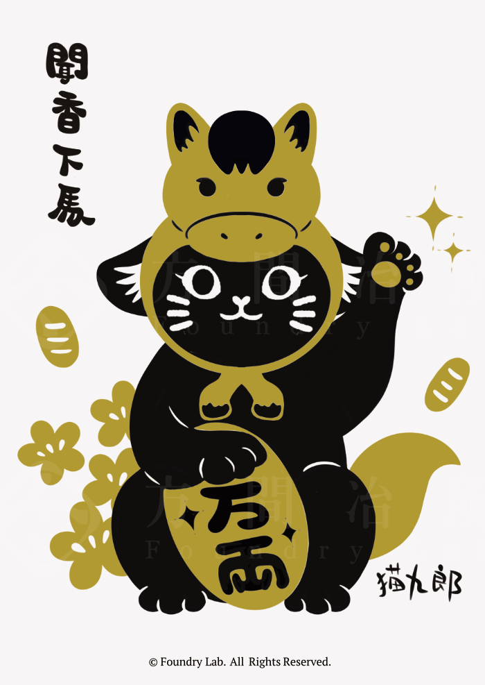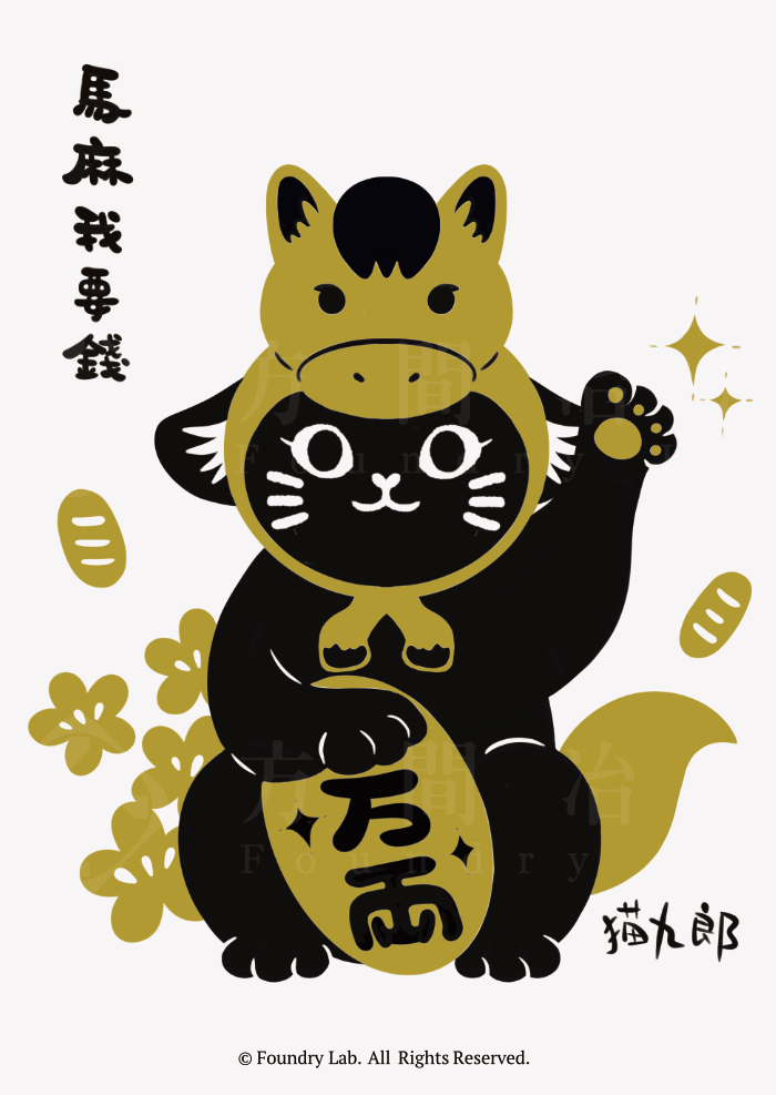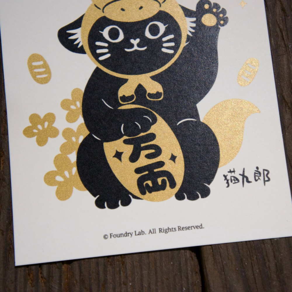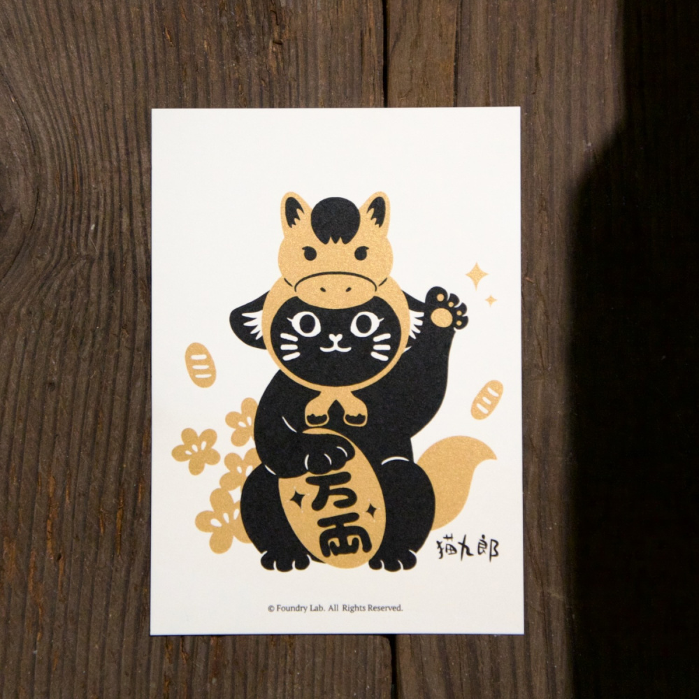 以往每年都會創作有的生肖頭套的招財貓春聯,今年讓給了九郎配戴,唯獨今年只有明信片賀卡版本,初版印刷80張。印製上使用黑和特殊金色兩色,底色保留了原材質的紙張白色,呼應 Pantone 在2026年的代表色「雲舞白」,也期望這張九郎明信片可以帶給大家溫暖。